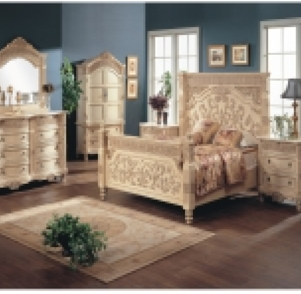 Light-toned wood with gold detailing, the kind of set that brightens the whole room with a palatial vibe.